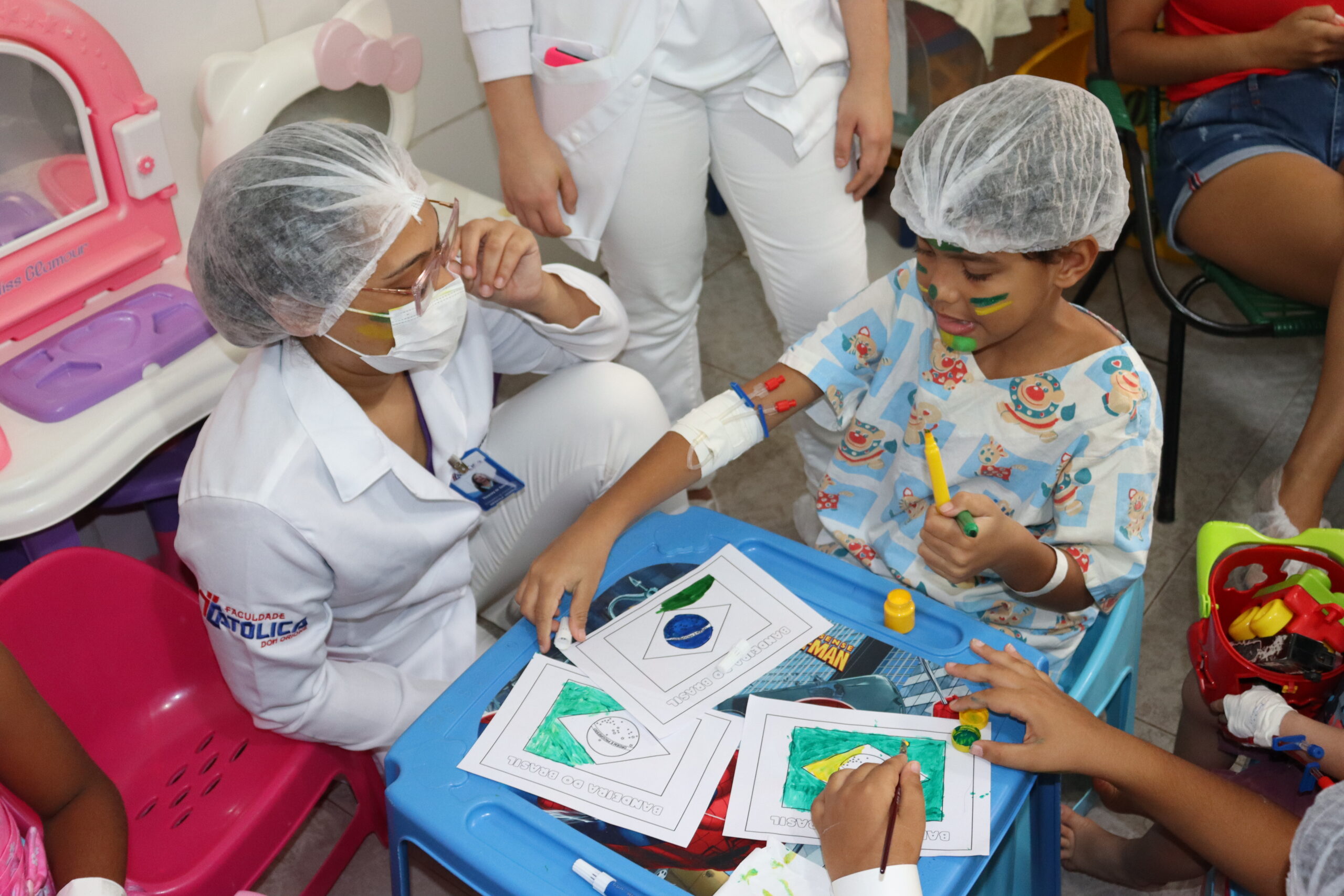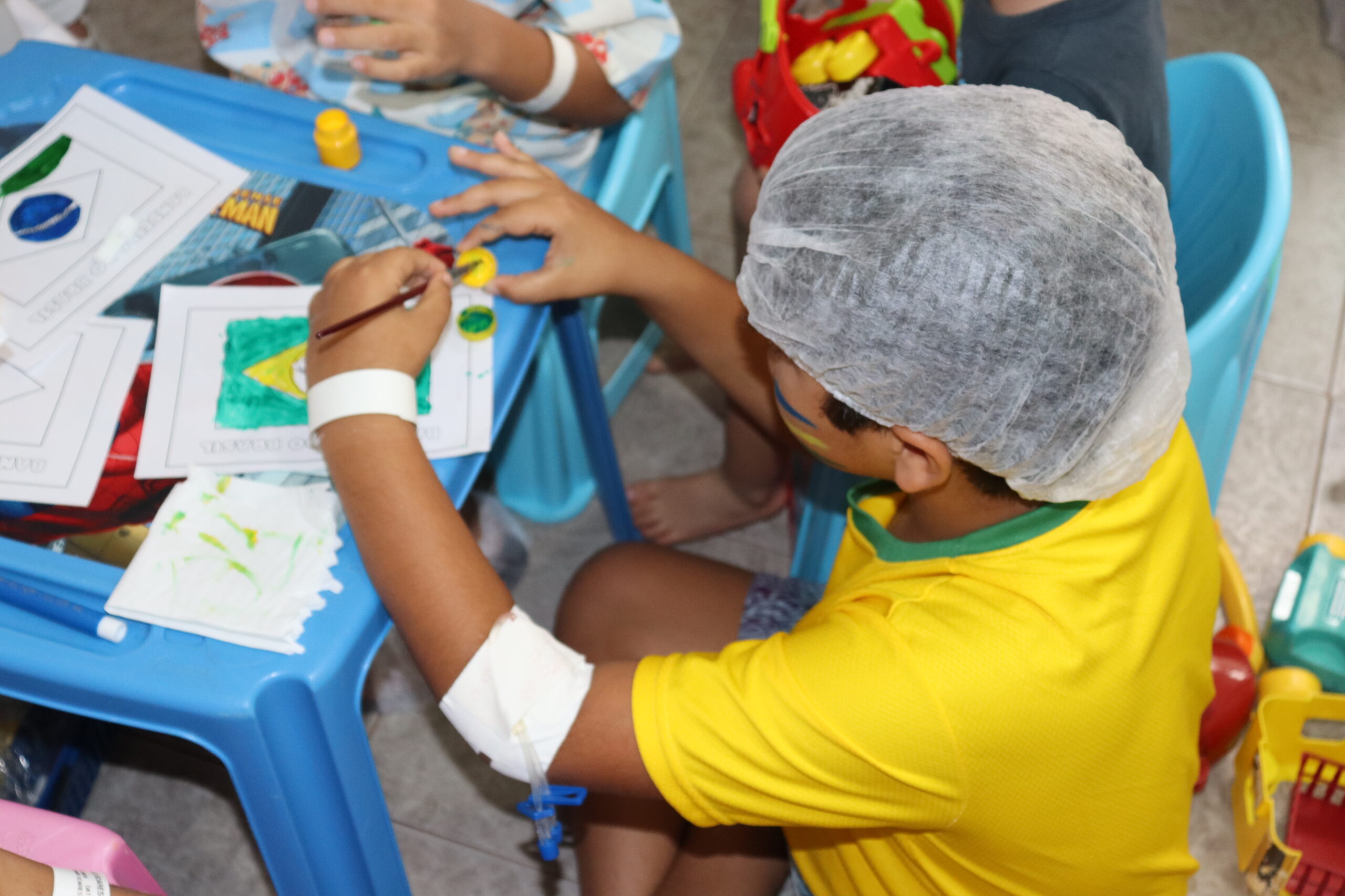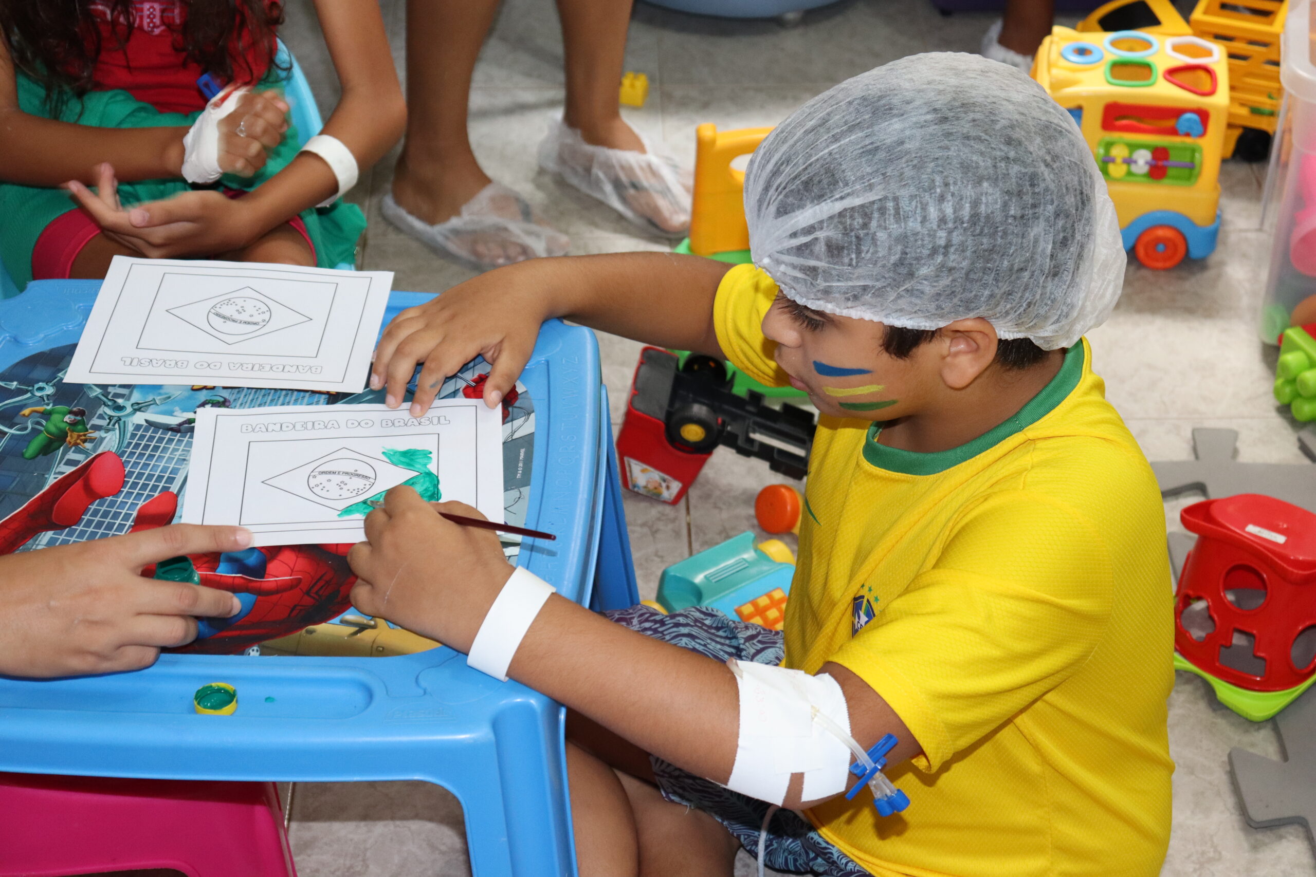 As crianças coloriram a bandeira do Brasil, brincaram e, com a ajuda da equipe de psicologia do hospital, tiveram os rostos coloridos com linda borboletas, coelhinhos e as cores da bandeira nacional.