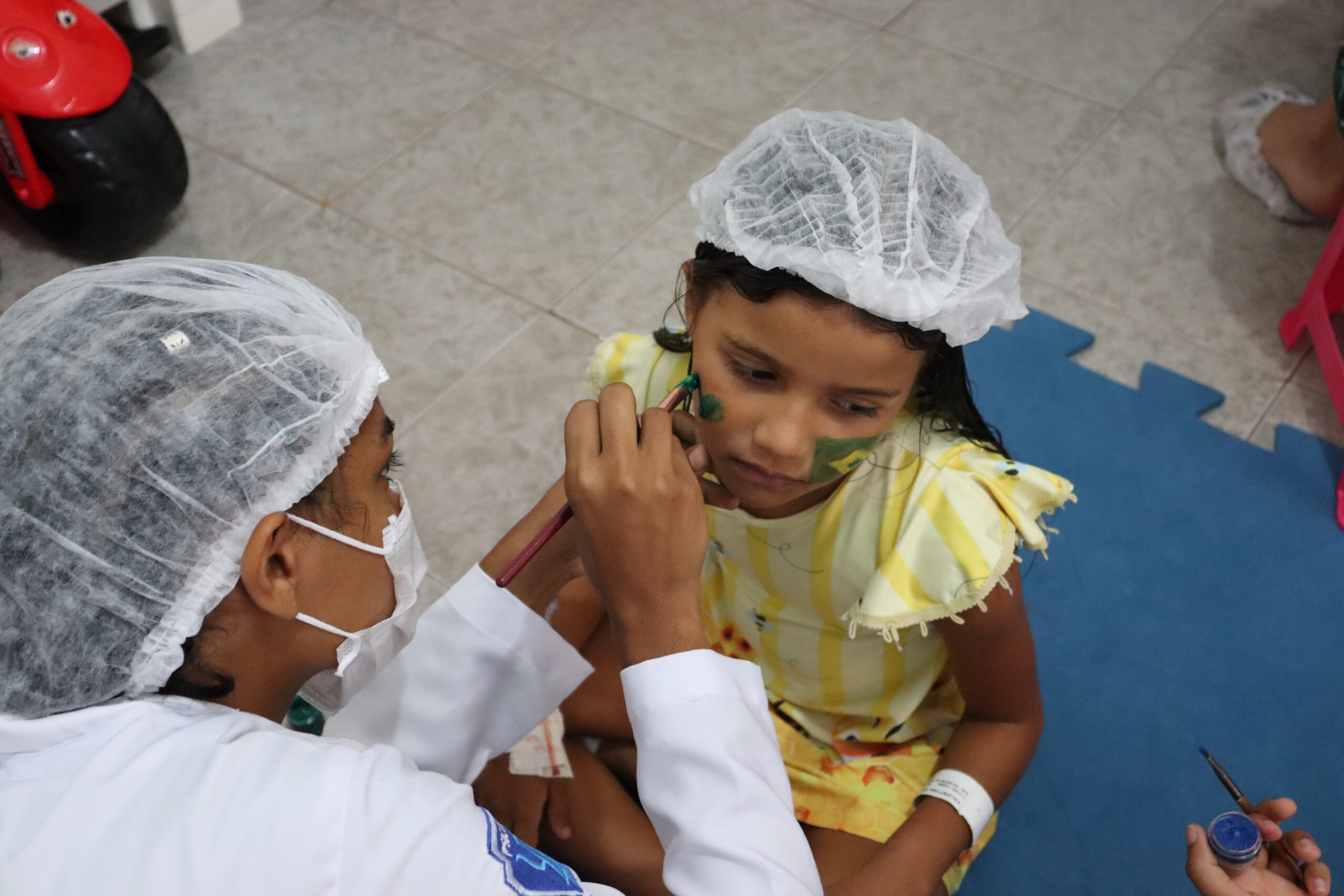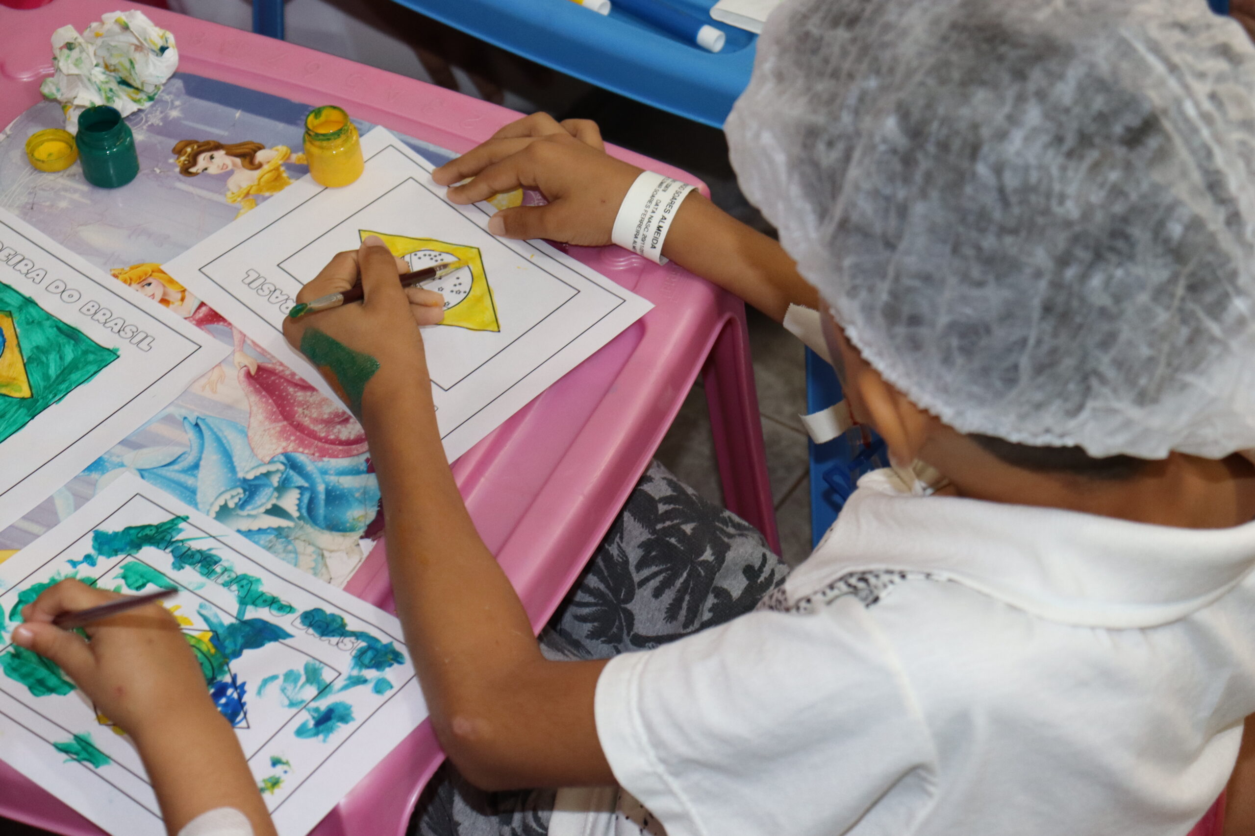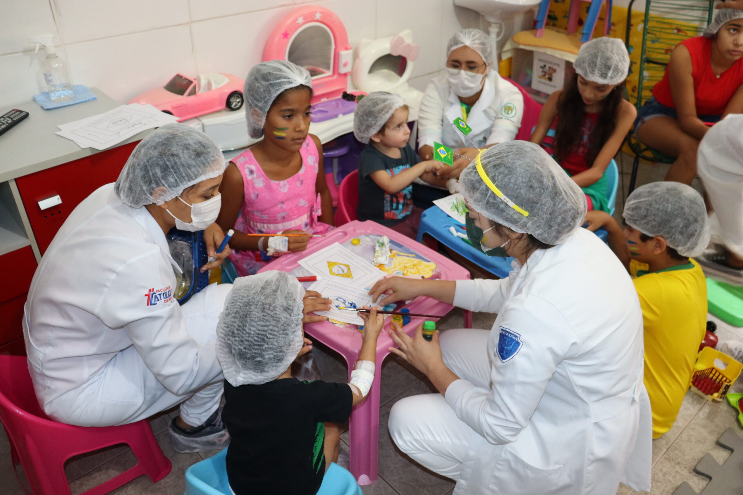 As crianças coloriram a bandeira do Brasil, brincaram e, com a ajuda da equipe de psicologia do hospital, tiveram os rostos coloridos com linda borboletas, coelhinhos e as cores da bandeira nacional.