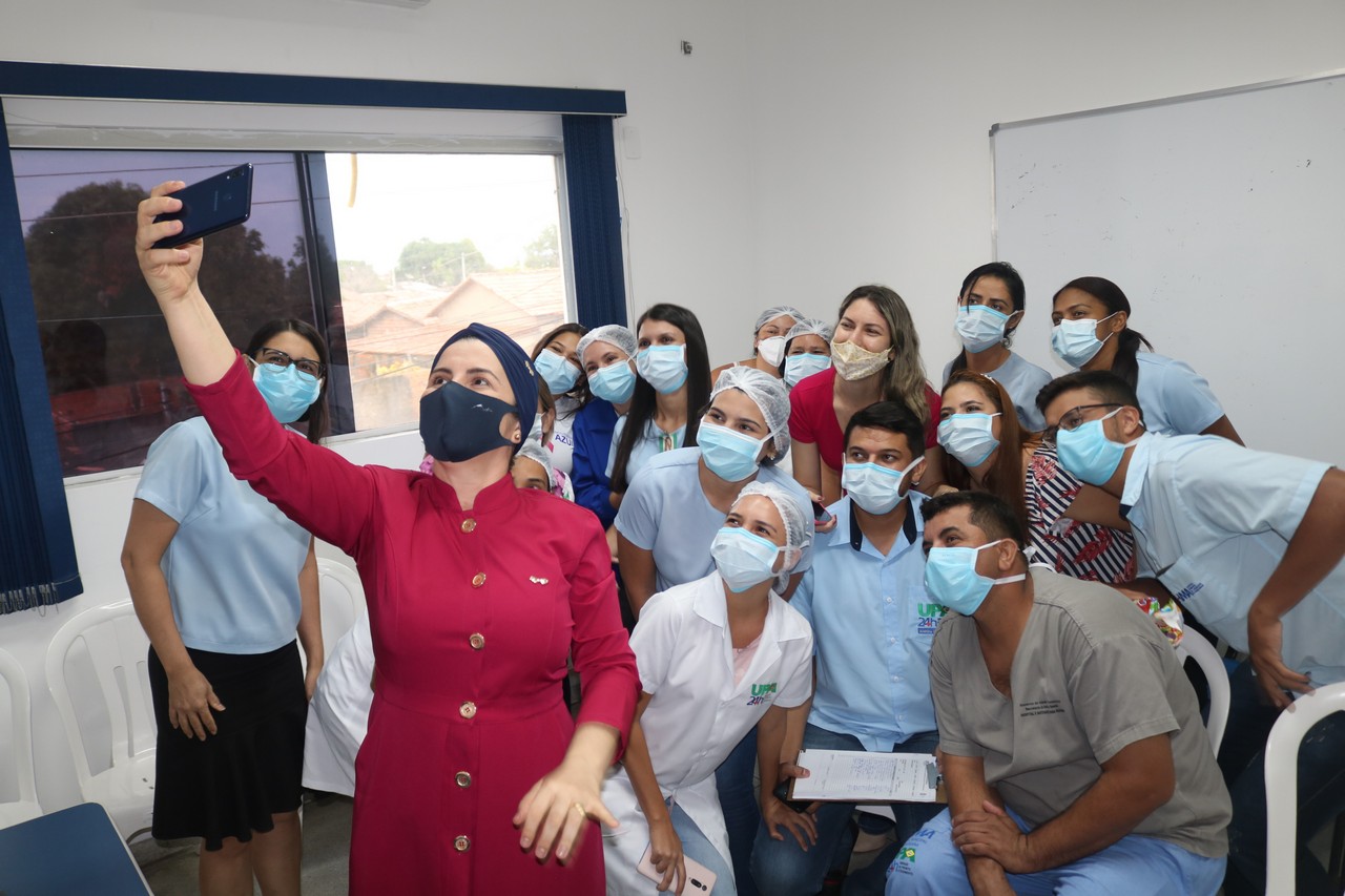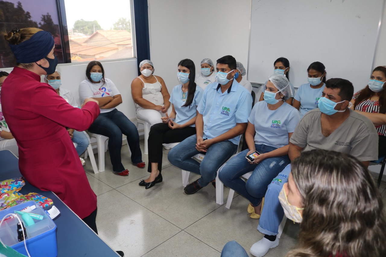 A odontóloga hospitalar, Marlei Pires, munida de escova, creme dental e dentes enormes, mostrou aos profissionais da Unidade de Pronto Atendimento Anatólio Dias Carneiro – UPA do Araguaína Sul e Hospital Municipal de Araguaína – HMA como realizar a escovação da forma correta.